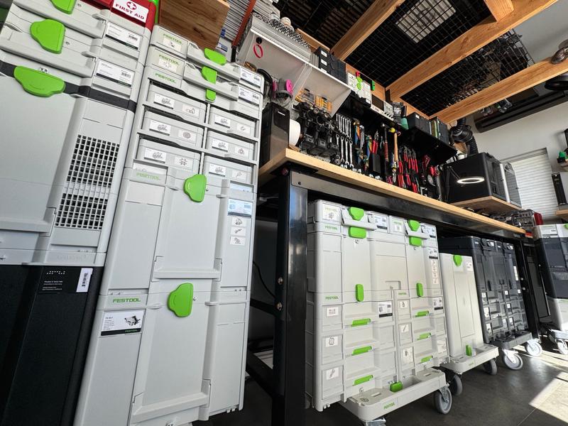 Systainers of every size, Sortainers, bit holders, worktops, and organizers — all on SYS-RB so the layout can shift on demand. Woodworking one day, electronics the next, extrusion and prototyping after that. No reorganizing. No hunting. Just roll, configure, and work.