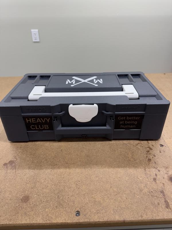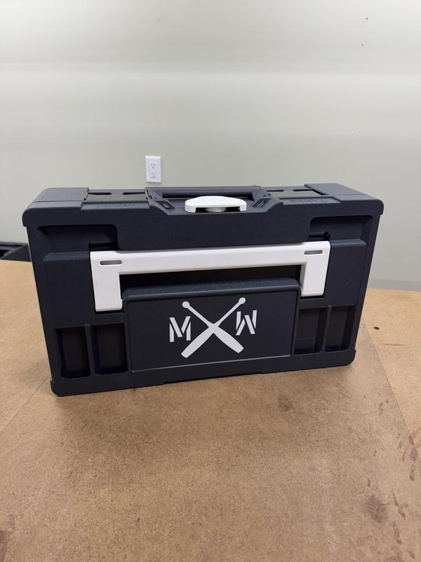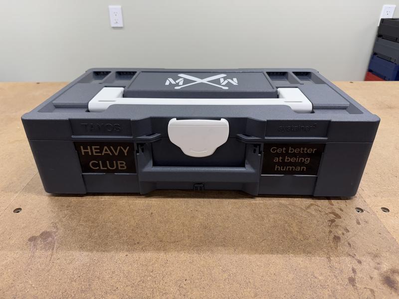 This fitout starts with a Systainer³ L 137 in anthracite, finished with a white catch and white handle. A couple of black anodized cards from Amazon and some quick laser work turned into labels and motivation. The lid carries the Mark Wildman logo, cut from vinyl on a Silhouette Cameo for a sharp, professional finish with minimal effort.