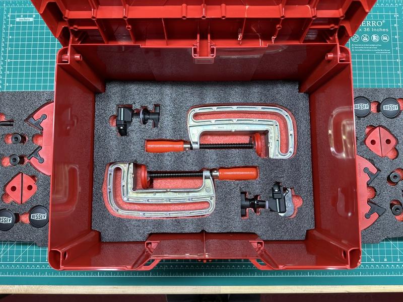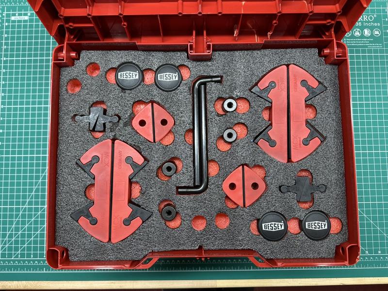 BESSEY KBM1 K-body Maxis VarioPivot Clamping System which allows the user to use a BESSEY K-Body clamp as a bench vise for detail work on legs and spindles.