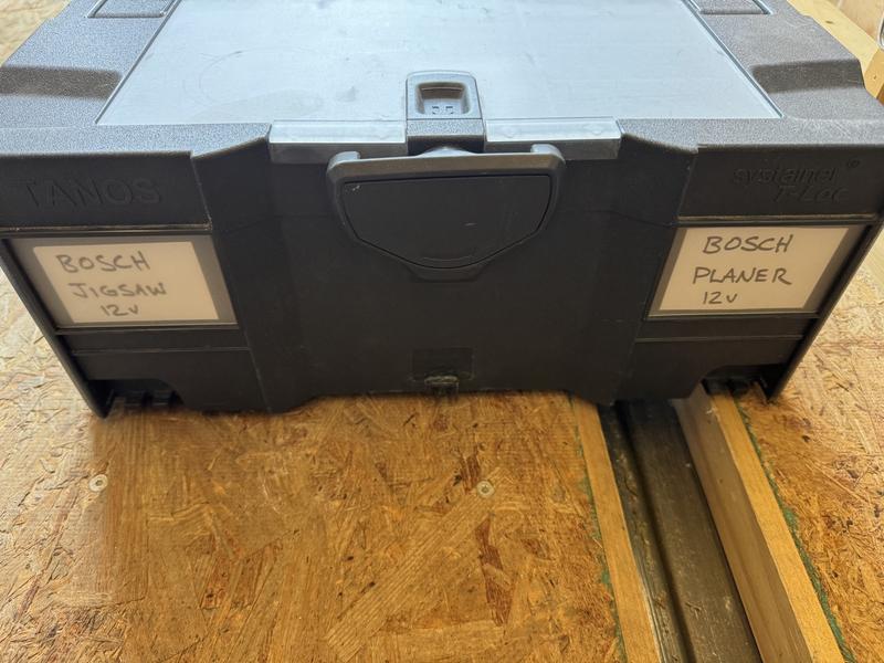 This Lid Compartment Systainer (M 187 equivalent) contains Bosch jigsaw and planer. The lid compartment stores various blades and accessories. The tools, batteries and accessories are neatly fitted out in kaizen foam. The card slots on the systainer offer a convenient place to label what the contents area, making this systainer easy to grab and go in an organized system.
