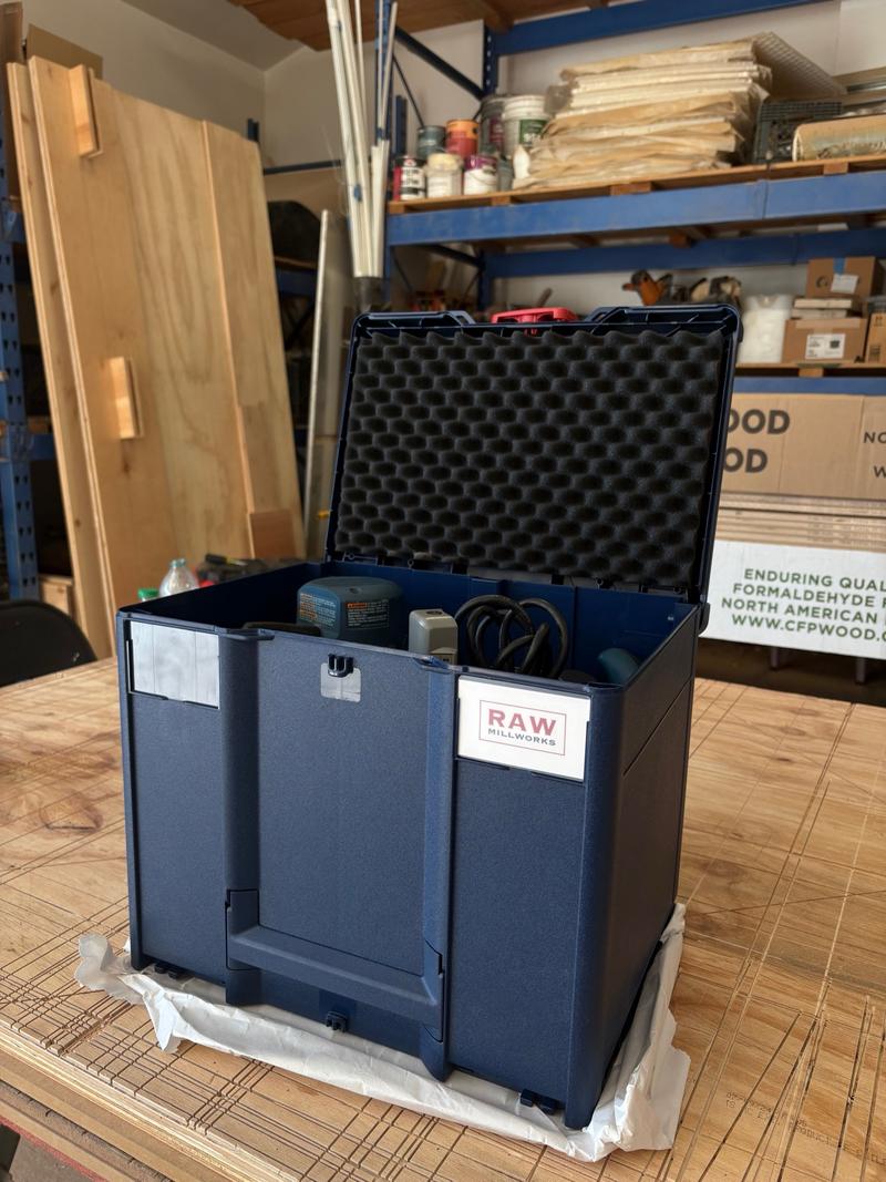 This Sapphire Blue Systainer³ M 337 with Carmine Red catch and a Black handle is precision-fitted with Kaizen foam to cradle a Bosch router—protecting the tool while keeping it instantly ready for work.