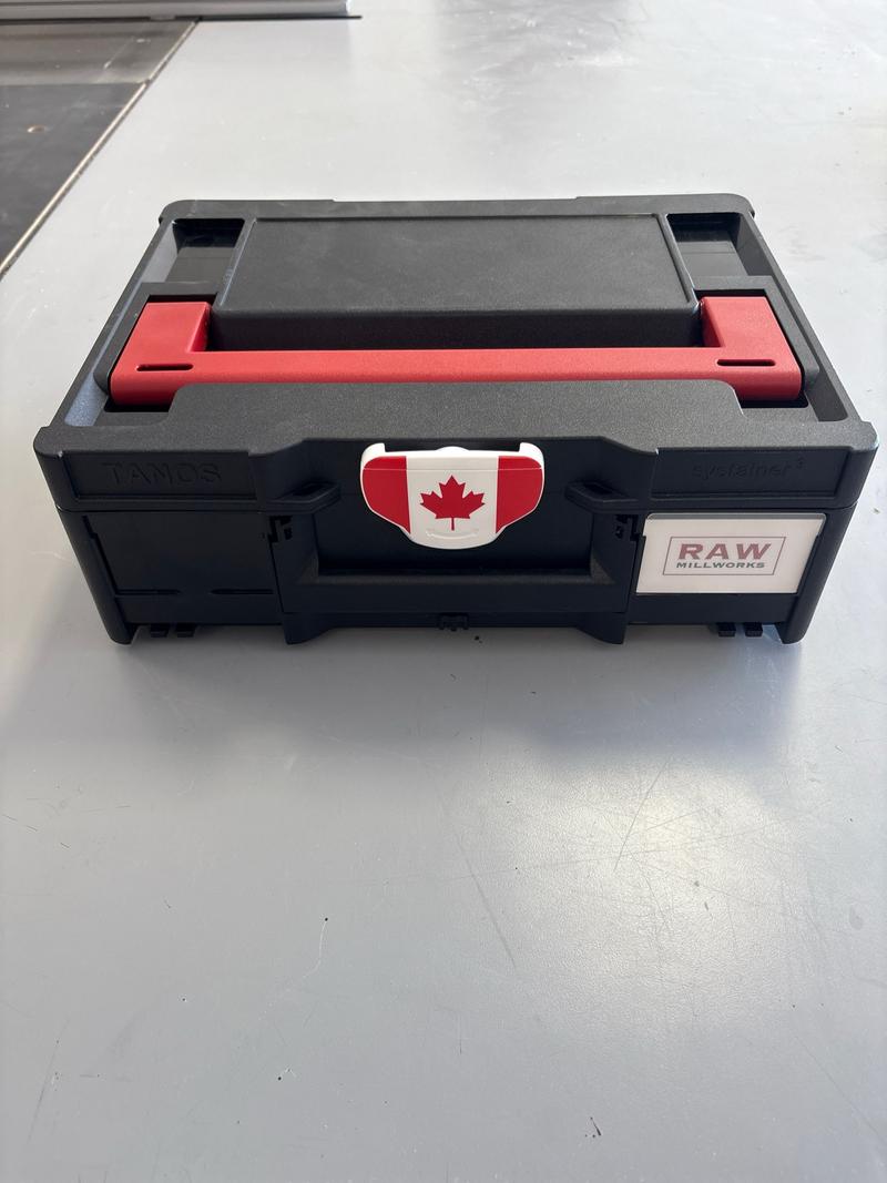 This fitout is in a Systainer³ M 112 Black with a red handle and the way cool Canadian Flag on a catch. The systainer is fitted out with Kaizen Foam that is carved to hold the JessEm Dowel Jig. Finally the lid has a vaulted lid foam.