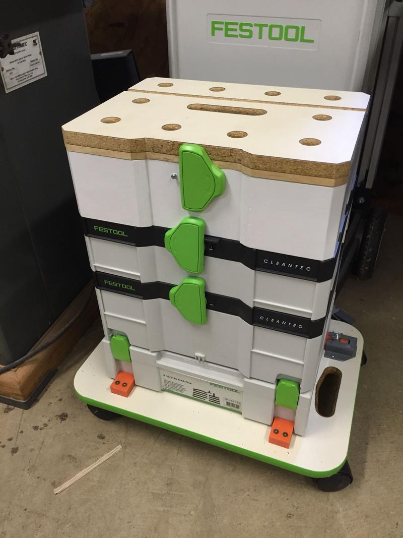 The icing on the cake is the MFT like top that he also adds to the stack. This set up, with his custom creations, amplifies the utility of Systainer and a stack that can easily roll within the shop and worksite.