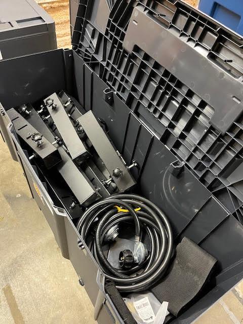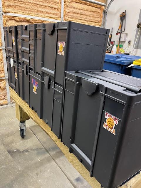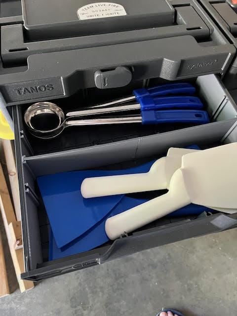 With a Sortainer/3 M 337, he 3D-printed his own left/right divider to fit longer utensils like pizza servers, cutters, and tongs. Twenty-four 12” pizza screens slot inside in M 337 with room to spare for other essentials. Table legs, hoses, and cleaning supplies? Those ride in an XXL 237 at the bottom. Stacked on a SYS-RB Cart, the whole rig pulls double duty — rolling transport and a side table for dough boxes. The M 337 even slides neatly onto shelves under catering tables, proving that every inch matters when packing a compact SUV.